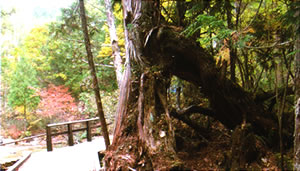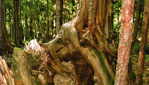 ![]() | 根上り木 200~300年経て、孫木が立派に成長したのを見とどけた後、老親木(おじいさん、おばあさん)の根株は土へと帰ってゆきます。 根がたこ足の様に持ち上がっているように見えますが、実際にはそこにも老木の根株があったのです。 |