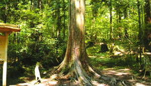 ![]() | 400年以上もの悠久の時、 風雪に耐えてきた 天然木曽檜の大樹 見事な力強い根張りが見えます。樹高と同じく35~40mの直径に根を張るといわれています。 |