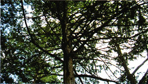 ![]() | 下から見上げた檜 大樹の曲がり このように下から大径木を見上げると大概3次元での曲がりがあります。 ただし、伝統木構造による日本の社寺建築は曲がり材を多用し必要とします。こういった曲がり材は他の檜の産地(吉野、東濃、飯能、土佐等)では、幼木のうちに切られてしまい確保が難しいのですが、木曽では比較的容易に確保することができます。 |