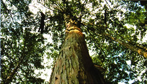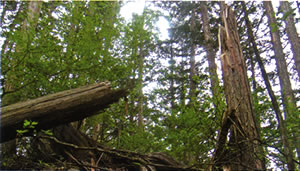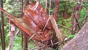 ![]() | 過熟木 自然淘汰 前述のごとく、過熟木は250~300年の生長の過程で、折れた枝から水が幹内部へ入り、内部で腐蝕菌が動くことによっておこる最大の欠点です。 現在樹齢300~350年のきの半分以上が過熟木となり、CO2の吸収率も弱くなってきています。 |