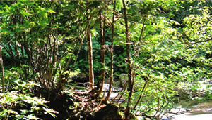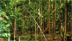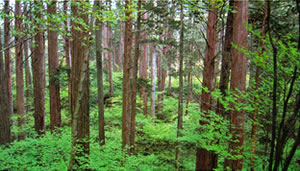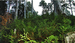 ![]() | 約25年前に30%位の択伐を行い、 樹間を広げた実験林 母樹の下からまるで緑のじゅうたんのように天然実生の幼樹が競争しながら育っていきます。300年前の奥千本もこのような感じであったと推測できます。 |