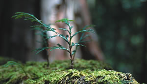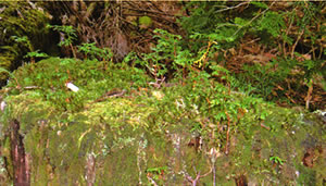 ![]() | 石の上で競争する天然木曽檜とヒバの幼樹 石の上に根を張っていた老木の根株の上に発芽し、30~40年経て、競争しながら成長している檜とヒバの幼樹の様子です。 この中のたった一本だけが競争に打ち勝ち成木となります。 |